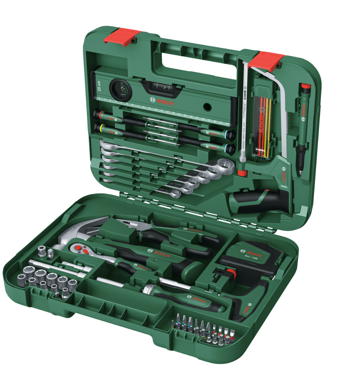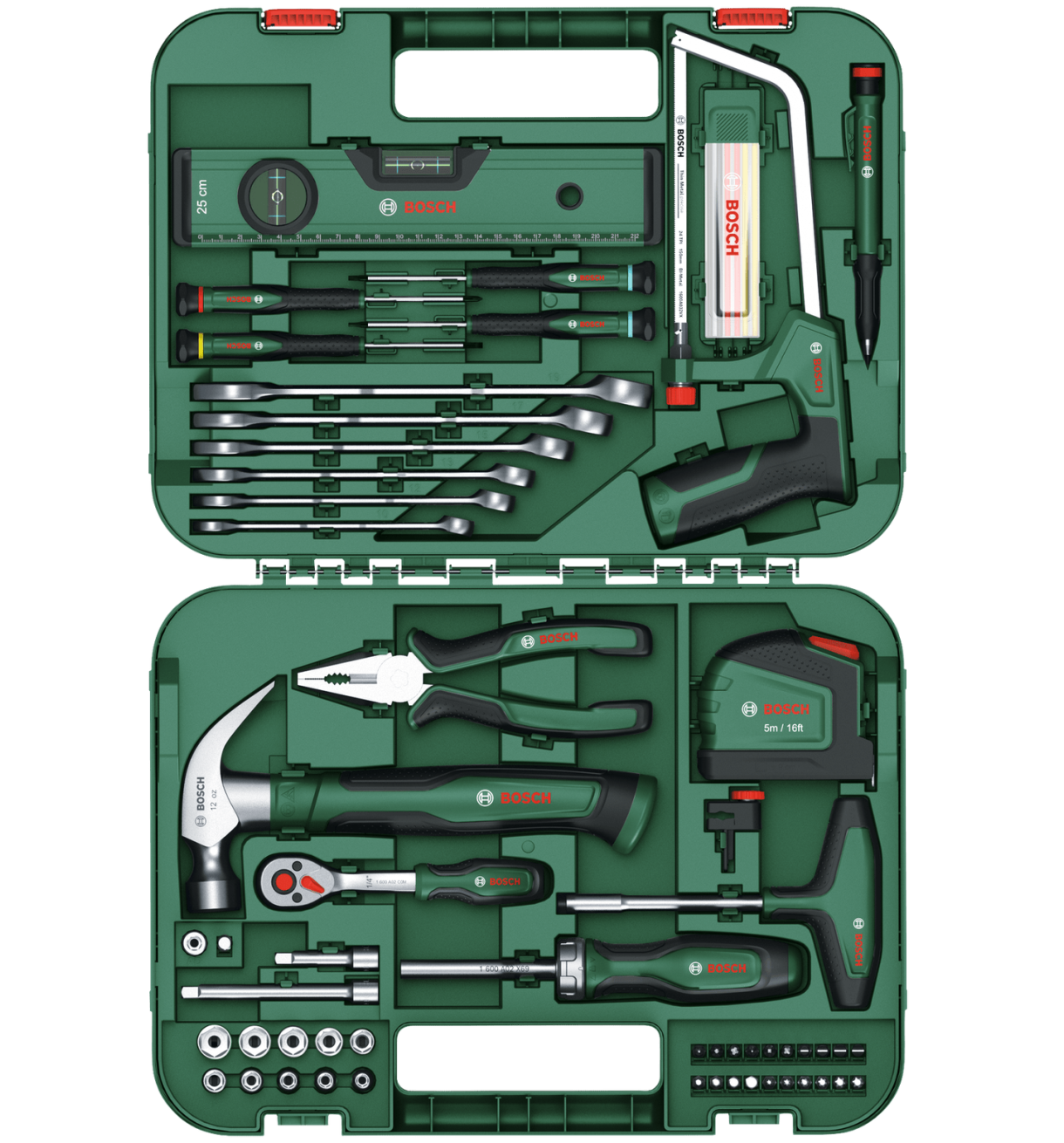 როდესაც მნიშვნელობა აქვს სიზუსტეს, შესრულებას და მოხერხებულობას, Bosch Advanced 64 ცალი ხელის ხელსაწყოების ნაკრები არის საუკეთესო კოლექცია გამოცდილი წვრილმანი ენთუზიასტებისთვის. ეს ყოვლისმომცველი ნაკრები შექმნილია მთელი რიგი ამოცანების შესასრულებლად - რემონტიდან და მოვლა-პატრონობიდან ავეჯის დამზადებამდე და სახლის მშენებლობამდე. კომპლექტში შეფუთულია მყარ სატარებელში, კომპლექტი აღჭურვილია საჭრელი ხერხით დამატებითი პირებით, მრავლობითი ხრახნებით და ქანჩებით, ქლიბით, ღვეზელით, სოკეტებით, კლანჭის ჩაქუჩით და ნაჭრებით. გარდა ამისა, ხელსაყრელი საზომი, სპირტის დონე და ღრმა ხვრელის მარკერი შედის პროექტის ზუსტი შედეგებისთვის. შექმნილია გამძლეობისთვის, ეს ხელსაწყოები დამზადებულია მაღალი ხარისხის მასალებისგან და აქვთ ერგონომიული მახასიათებლები საბოლოო კონტროლისა და კომფორტისთვის.