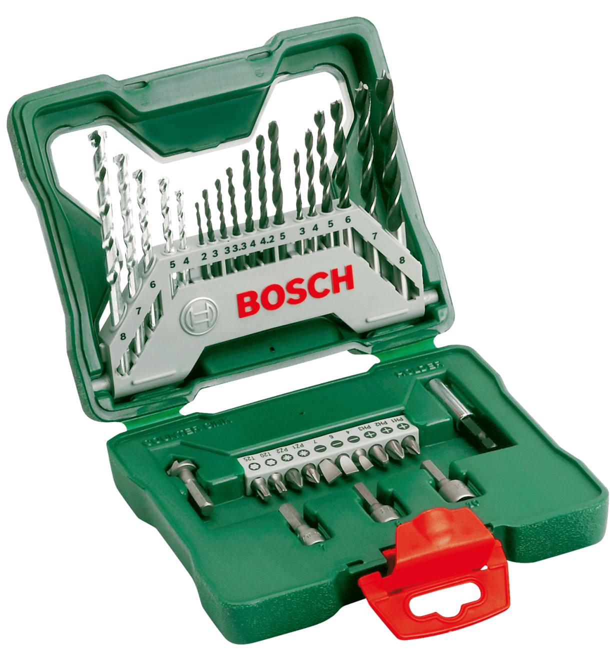 - 7 ბურღი მეტალისთვის HSS-R, Ø 2–5 მმ, 5 ბურღი ქვისთვის, Ø 4–8 მმ, 6 ბურღი ხისთვის, Ø 3–8 მმ, 10 ბიტის თავაკი, L = 25 მმ, PH 1/2/3, PZ 1/2, S 4/6/7, T 20/25, 3 სოკეტის ქანჩები ექვსკუთხა თავის ჭანჭიკებისთვის, Ø 7/8/10 მმ, 1 უნივერსალური დამჭერი მაგნიტის, 1 ზენკერი