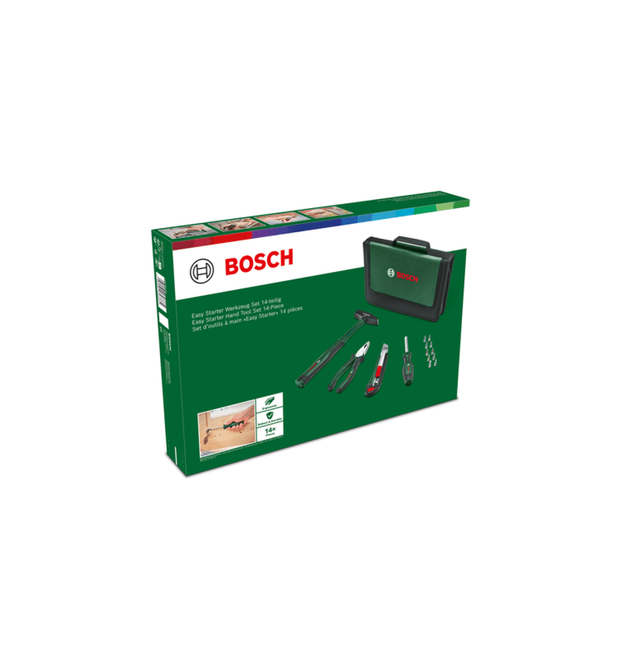 Bosch-ის 14 ცალი მარტივი დამწყებ ხელსაწყოების კომპლექტს აქვს ყველა ხელსაწყო, რომელიც აუცილებელია წვრილმანი შეკეთებისა და მოვლისთვის, ავეჯის აწყობისთვის ან ძირითადი კონსტრუქციისთვის. მოხერხებულად შეფუთული პორტატული ქსოვილის ელვა ჩანთაში, კომპლექტი აღჭურვილია კომბინირებული პლიერებით, 300 გრამიანი ინჟინერის ჩაქუჩით, ჩამკეტი დანა და უნივერსალური ხრახნიანი, ასევე 10 ბიტით. თითოეული პროდუქტი მტკიცედ არის დამზადებული მაღალი ხარისხის მასალებისგან და ერგონომიულად შექმნილია ხანგრძლივი მომსახურების ვადის, ასევე ოპტიმალური